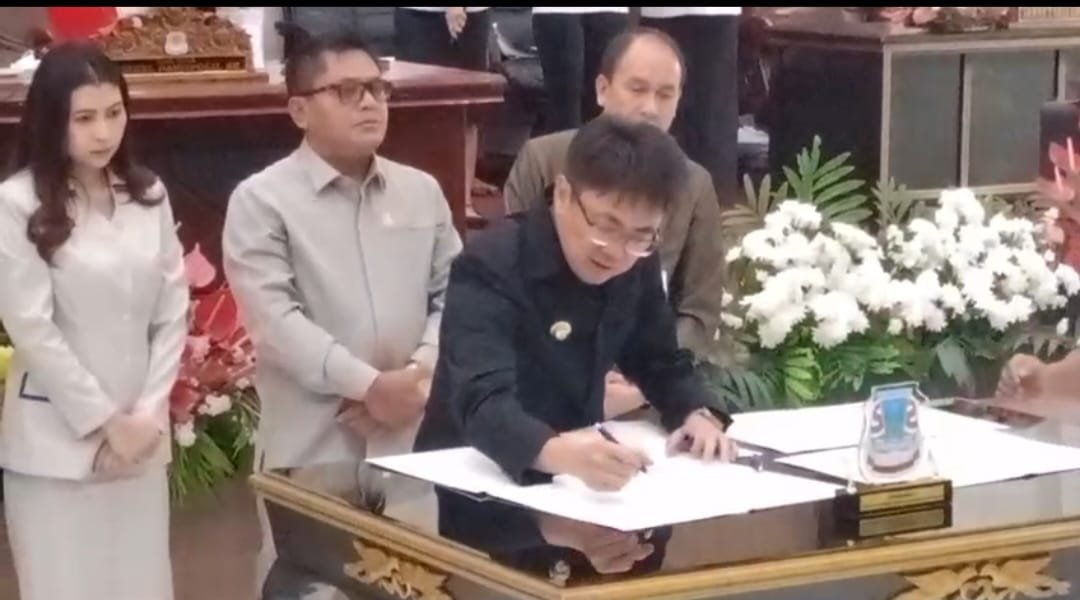 Penandatanganan dilakukan oleh Asisten III Bidang Administrasi Umum, Donal Supit, S.H., M.H., Ketua DPRD Dra. Aaltje Dondokambey, M.Kes., Apt., Wakil Ketua Mona Cloer, S.H., M.H., Wakil Ketua Maykel Damapolii, S.E., serta Wali Kota Manado, Andrei Angouw.