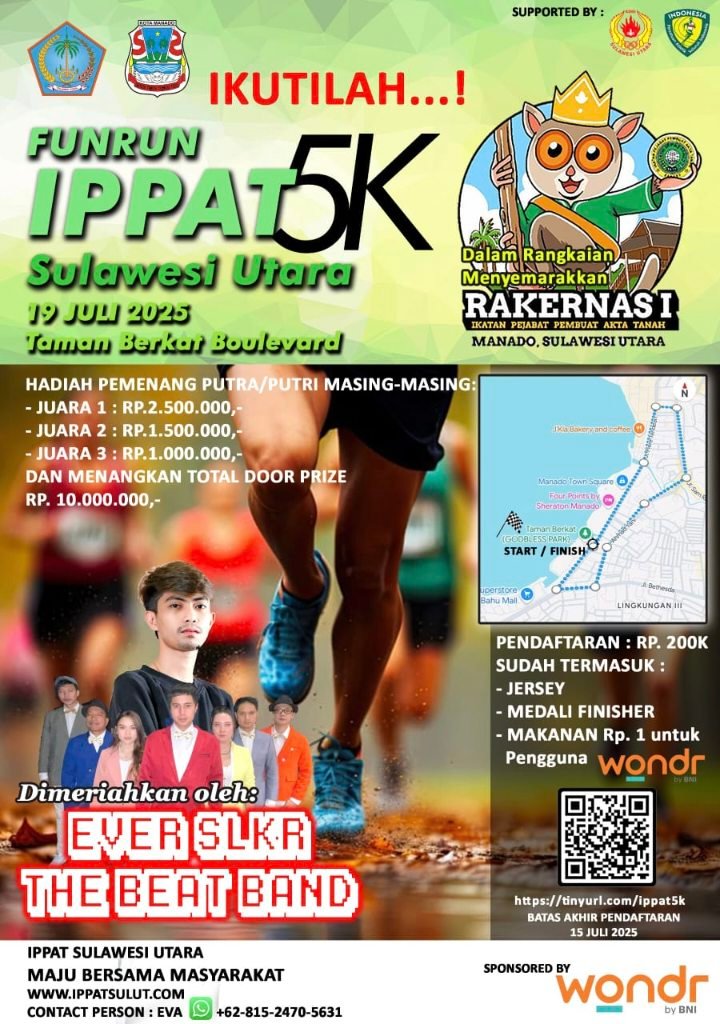 MANADO – Dua event bergengsi siap menghidupkan Kota Manado di pertengahan Juli 2025. Ikatan Pejabat Pembuat Akta Tanah (IPPAT) Sulawesi Utara akan menggelar Rakernas I dan Fun Run 5K secara beruntun pada 18–19 Juli 2025.