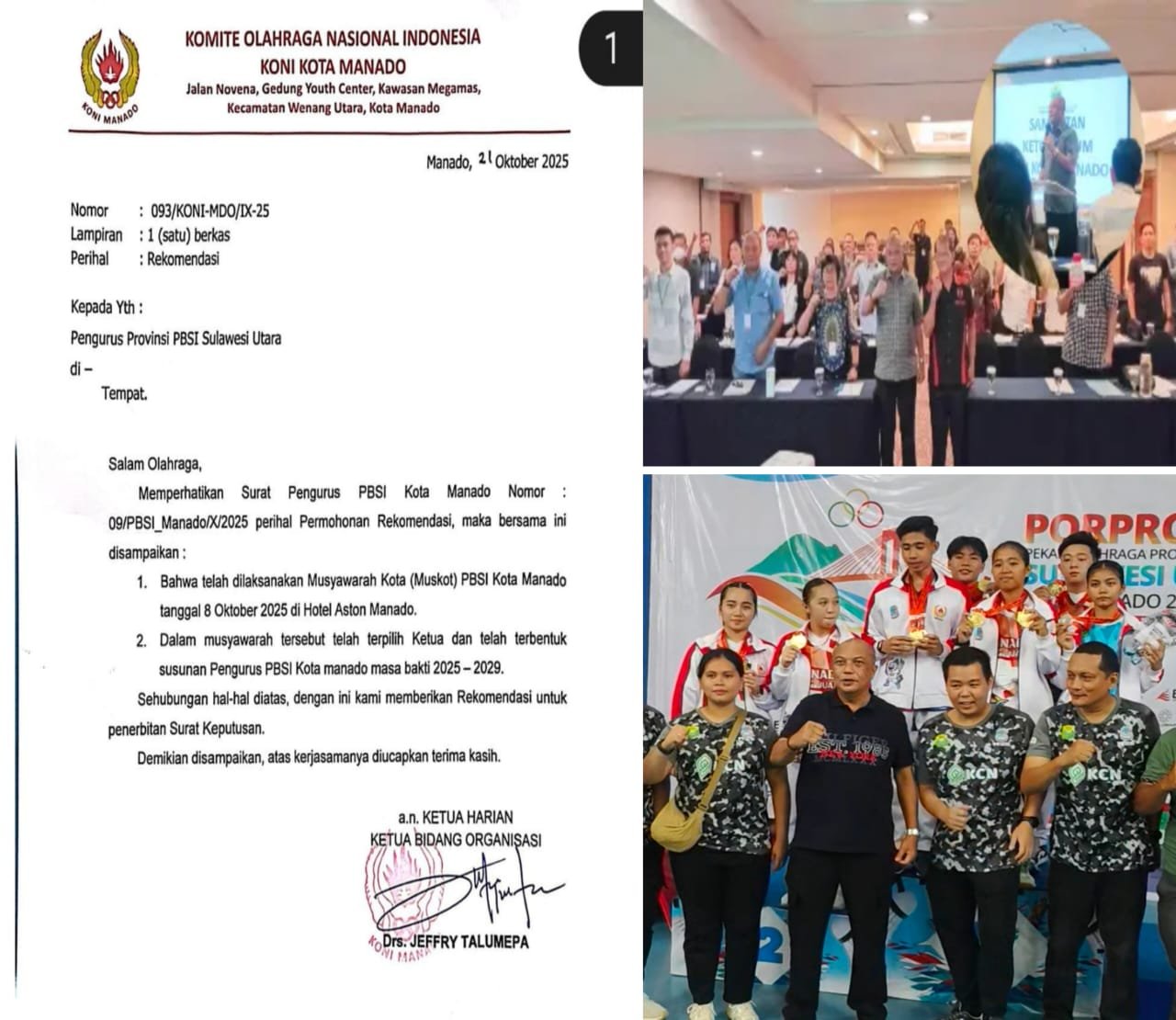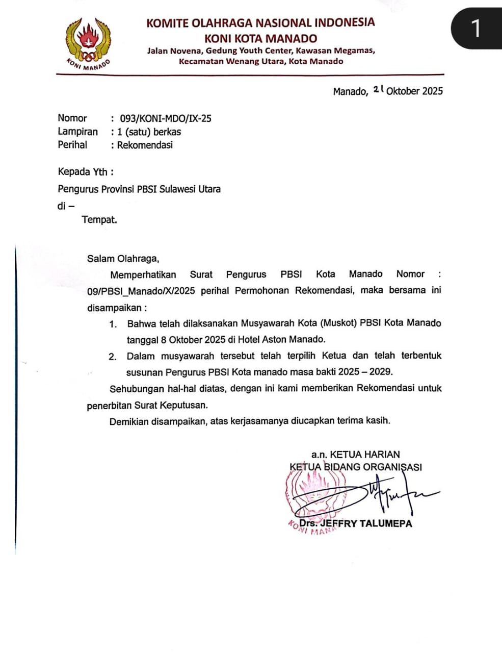 Legalitas Muskot tersebut diperkuat dengan Surat Rekomendasi resmi KONI Kota Manado Nomor 093/KONI-MDO/IX-25 tertanggal 21 Oktober 2025, yang dikeluarkan setelah KONI Manado memverifikasi pelaksanaan Muskot dan hasil keputusannya.