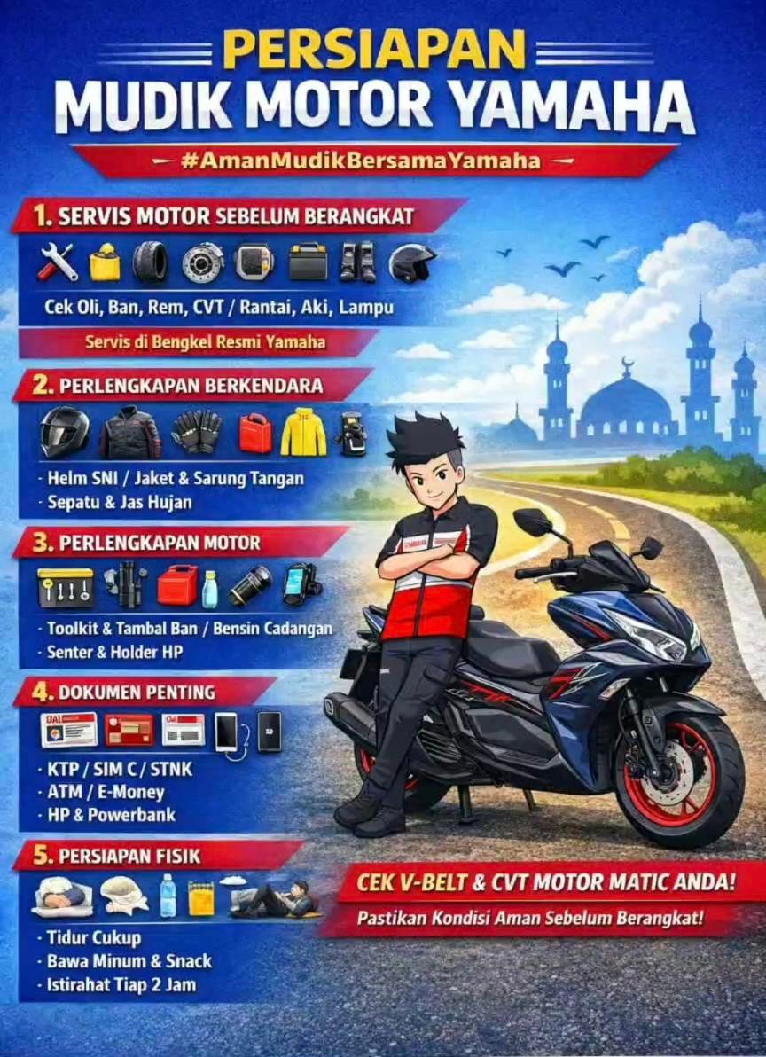 Melalui edukasi tentang Persiapan Mudik Motor Yamaha, masyarakat diingatkan agar tidak hanya fokus pada tujuan, tetapi juga memastikan kondisi kendaraan dan fisik pengendara tetap prima.
