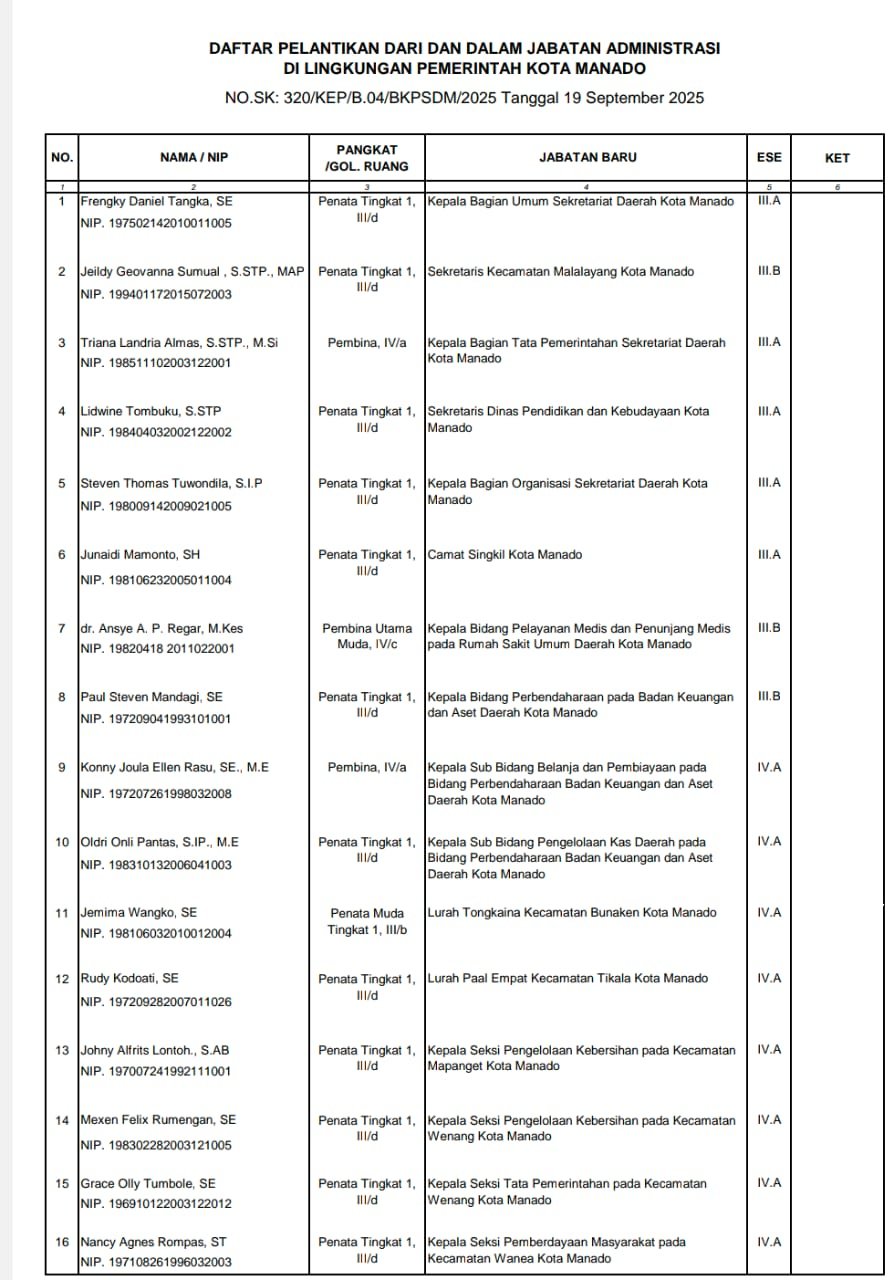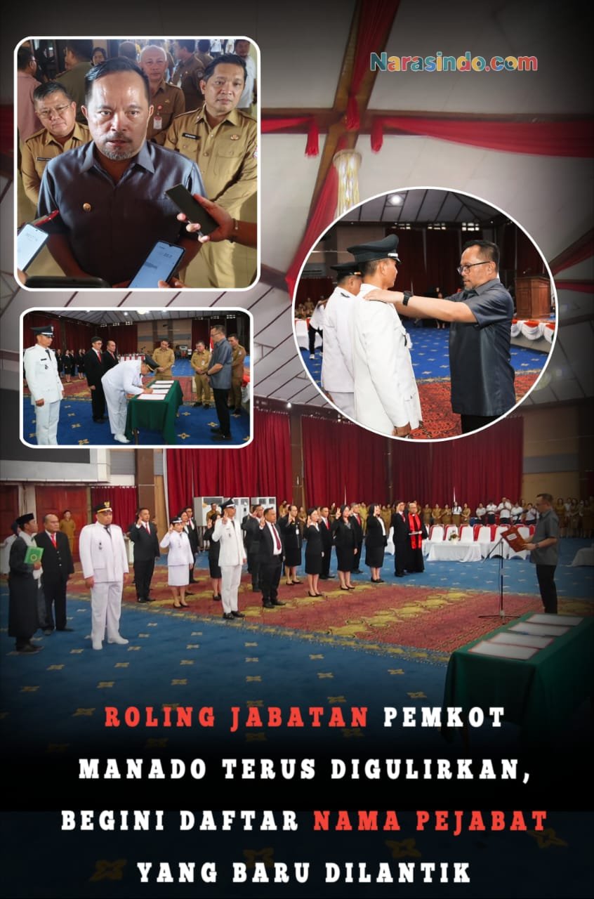 MANADO,Narasindo.com – Setelah melakukan penyegaran di jabatan esselon dua, kali ini ini Wali Kota dan Wakil Wali Kota Manado Andrei Angouw dan dr Richard Sualang (AARS) melantik dan mengambil sumpah janji jabatan administrator dan pengawas dilingkup Pemkot Manado yang dilaksanakan di Aula Serbaguna, Senin (22/09/25).)