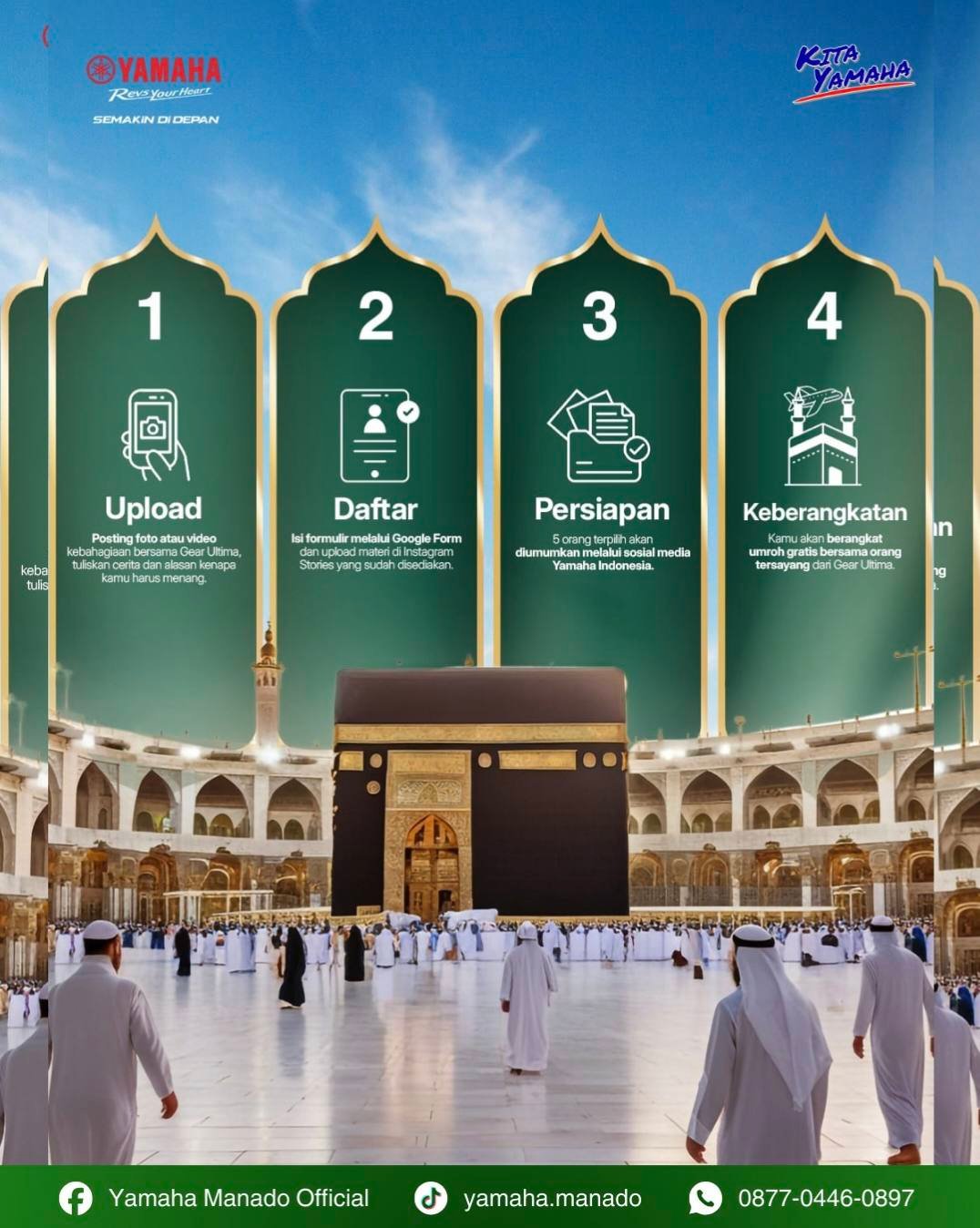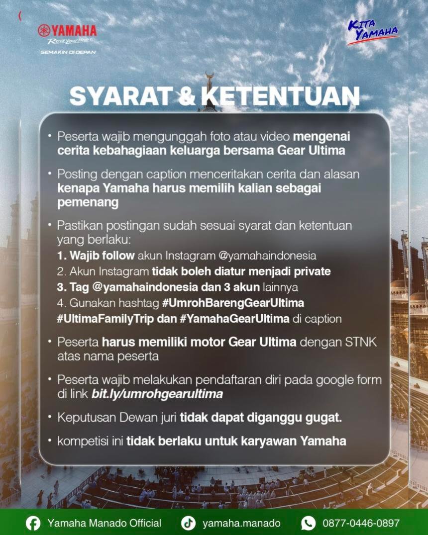 Bagi masyarakat yang tertarik mengikuti program ini, Yamaha membuka kesempatan luas untuk berbagi cerita kebahagiaan bersama keluarga dan meraih peluang berangkat umroh secara gratis.